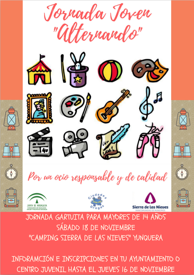 El sábado 18 de Noviembre de 10 a 16 horas se celebrará la Jornada Joven «Alternando» para jóvenes mayores de 14 años en el camping Sierra de las Nieves de Yunquera. Los interesados pueden inscribirse hasta el jueves 16 de noviembre en el Ayuntamiento rellenando la solicitud que se adjunta. La jornada incluye transporte, camiseta