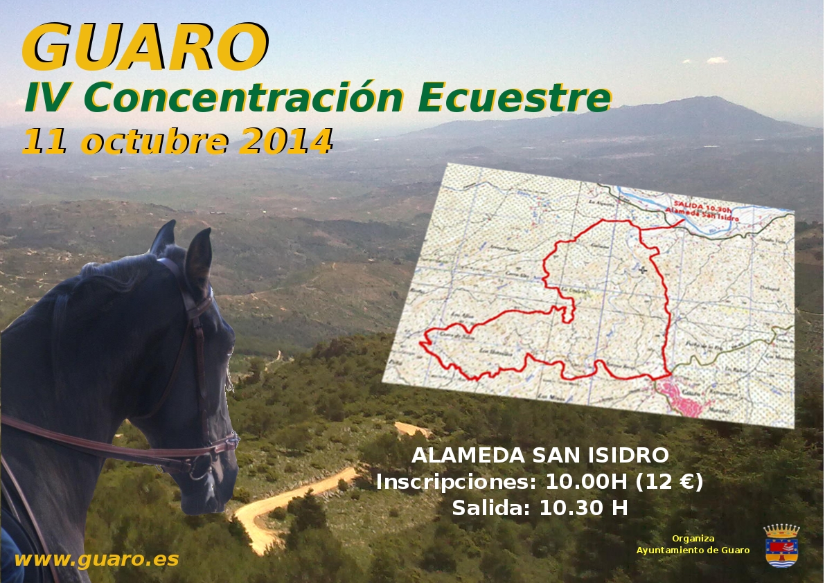 El próximo 11 de octubre tendrá lugar la Concentración Ecuestre que organiza el Ayuntamiento de Guaro y que ya cuenta con su cuarta edición. Como cada año se realizará una ruta a caballo con salida desde la Alameda de San Isidro. Las inscripciones son ese mismo día a las 10.00 de la mañana antes de comenzar la ruta. El precio de inscripción son 12 € en los que se incluye una camiseta, el desayuno y la comida del día. La ruta empieza a las 10.30 por lo que se ruega sean puntuales a la hora de las inscripciones.